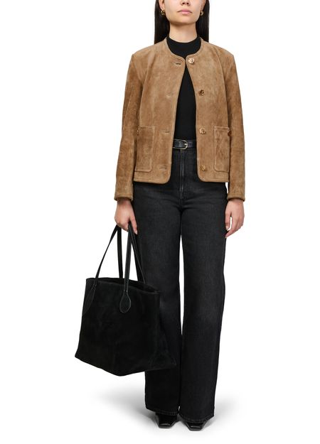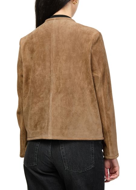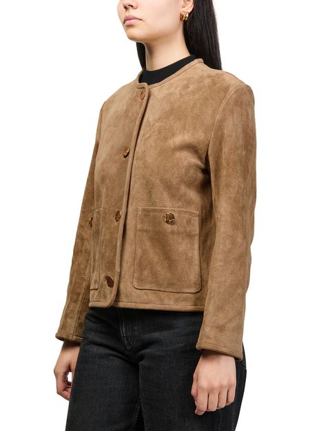 Reveal Arma's Sogno textured suede jacket, a collarless, short silhouette crafted from supple suede. Embellished buttons and patch pockets add refined detail, while the button fastening and long sleeves ensure versatility. This piece transitions effortlessly from day to night, elevating any casual look with modern sophistication.