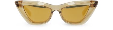 Bottega Veneta's sunglasses feature thick temples and gold finishes for a luxurious touch. The cat-eye shape adds a hint of vintage glamour to any look. The brand’s logo is discreetly displayed on the temples, adding a refined and elegant detail. Perfect for adding a chic finishing touch to any outfit.