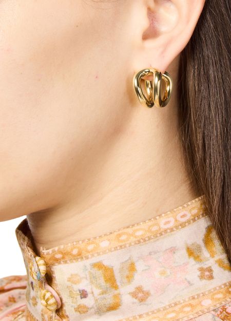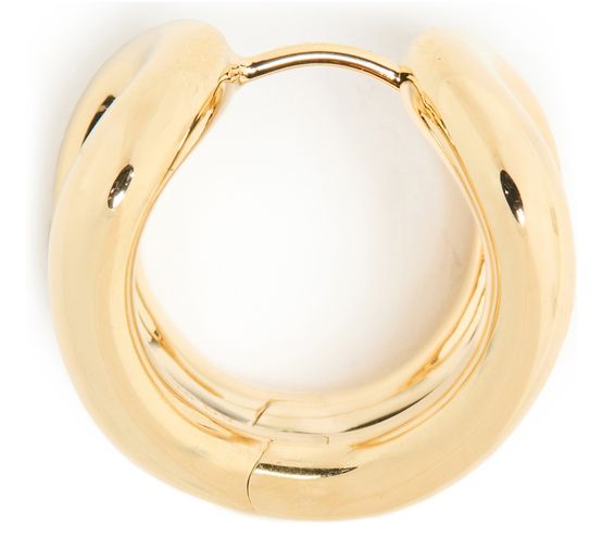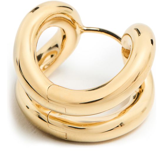 Discover Lie Studio's Steffie earrings, featuring a gold finish and engraved logo, perfect for a modern touch. With a built-in clasp at the back, each piece is sold individually, offering a singular style statement.