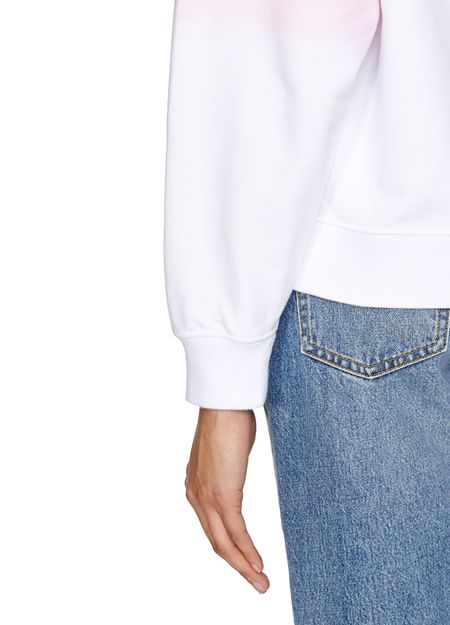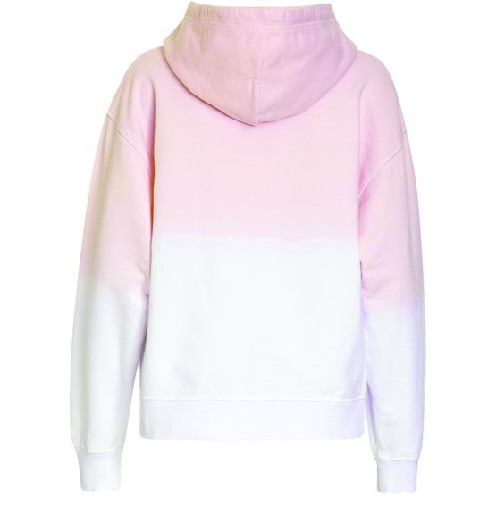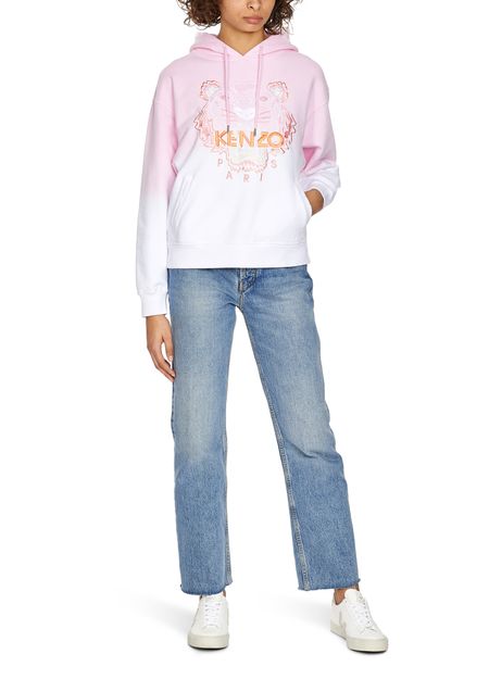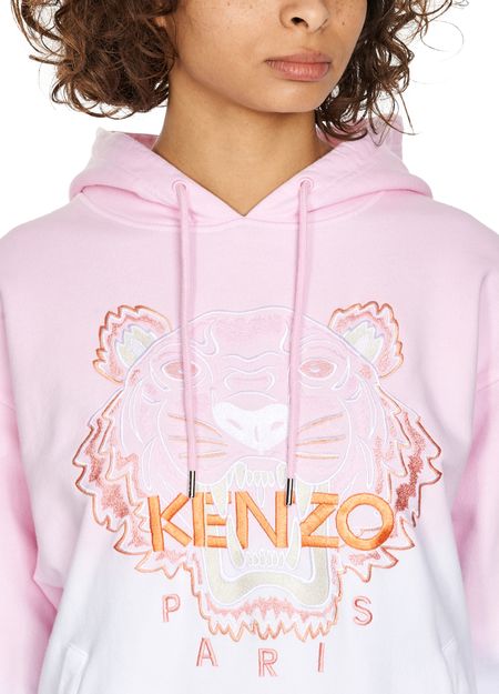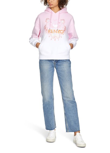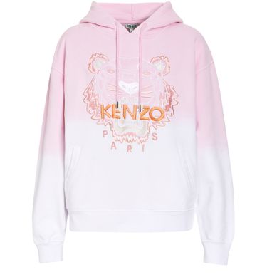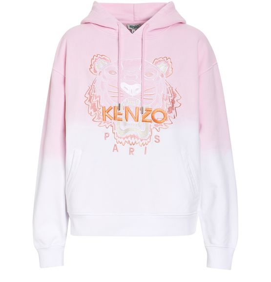 The Tiger print has become the signature of the Kenzo company. It comes in yellow and purple on this cotton hoodie, which you wear with a straight skirt and a pair of trainers.