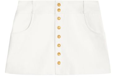 Celine's Trapeze mini skirt in cotton twill embodies effortless elegance with its classic fit and high-waisted design. Featuring two front pockets and two patch pockets on the back, it combines practicality with style. Adorned with eight Triomphe snap buttons, this Italian-made piece is a must-have for the modern wardrobe.