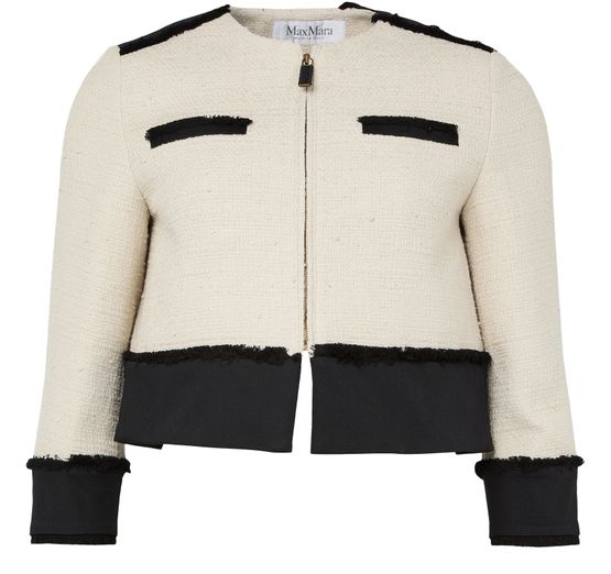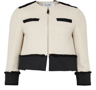 Reveal Max Mara's tweed-effect jacket, a cropped silhouette with a modern collarless design and three-quarter sleeves. The zipper closure adds a sleek touch, while the textured finish brings a refined edge. Perfect for elevating both casual and sophisticated looks with effortless versatility.