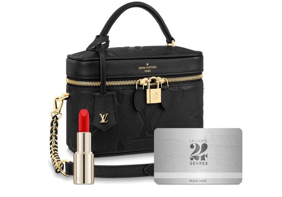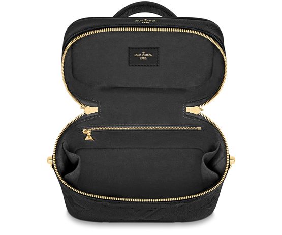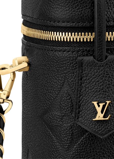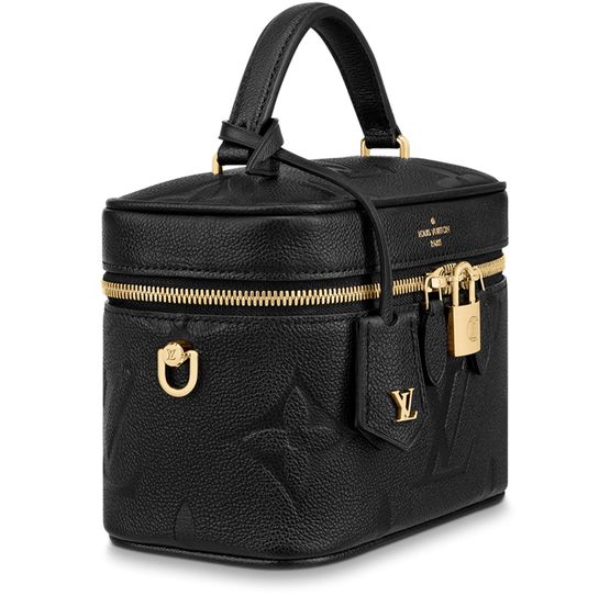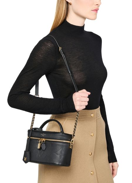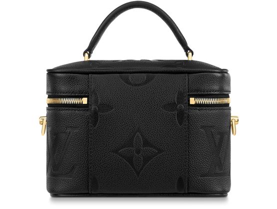 With its elegantly modern shape, leather top handle, and subtle embossed Giant Monogram pattern, the Vanity PM handbag is the perfect day-to-evening bag. It features two leather-tassel zip pulls for easy opening and a padlock for secure closure. The adjustable and removable leather strap is adorned with a small chain, interwoven with the leather.