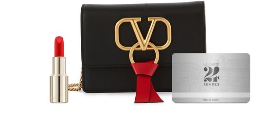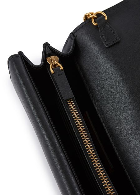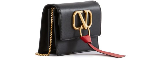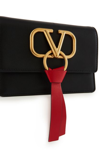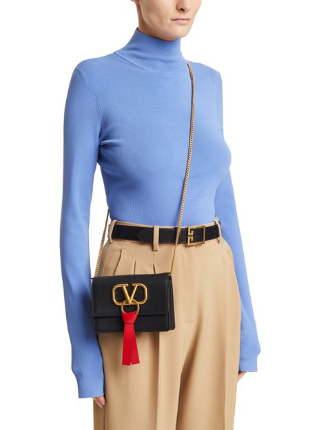The designer Valentino Garavani has produced a most elegant clutch bag, with a fine chain for a refined look when worn on your shoulder. This Valentino Garavani Vring pocket has several pockets inside for convenient storage of your personal belongings. On the front, there is the metal logo, to which a ring and a leather ribbon in contrasting colour are attached. A sophisticated creation to...
