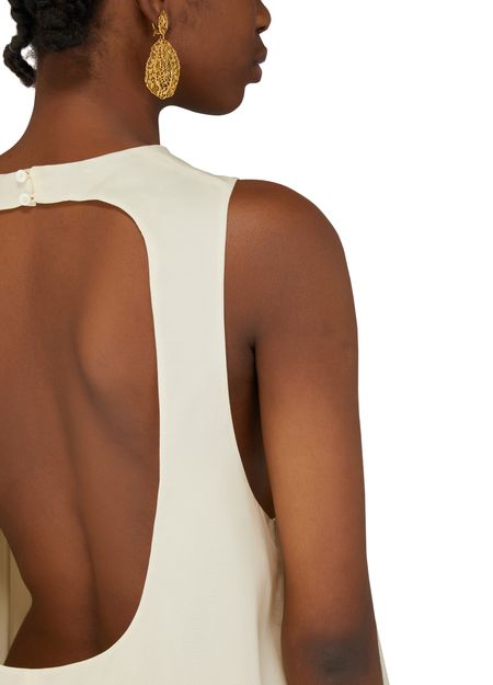 • Description : Sleeveless, crew neck, bare shoulder, back button fastening, open back, loose fit, shorter at the front, pleat and gather details.