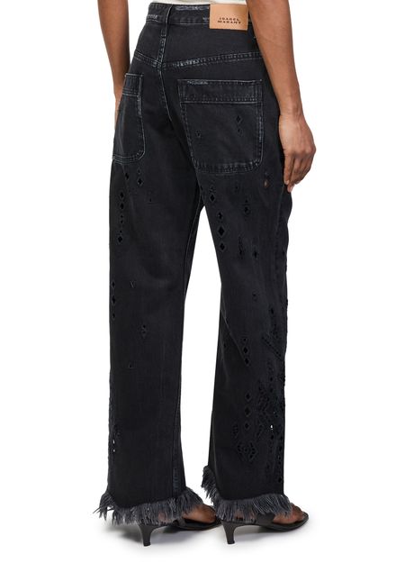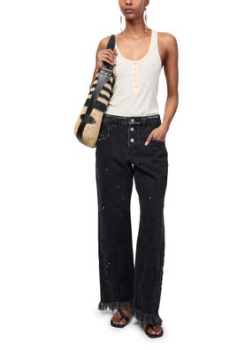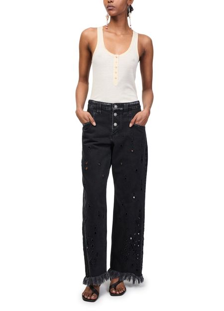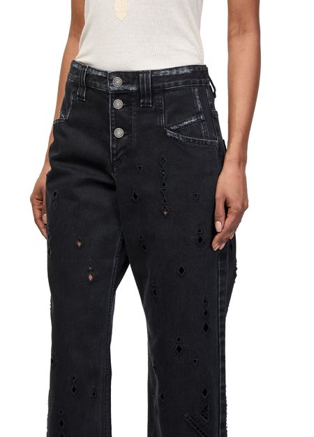 Reveal Isabel Marant's Amia jeans, crafted with a front buttoned closure and ankle-length silhouette. The contrast stitching and fringe details add a modern twist, while belt loops and two front pockets ensure both style and practicality. Perfect for elevating everyday looks with effortless sophistication.