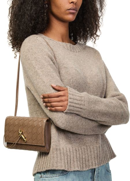 Reveal Bottega Veneta's Andiamo clutch with shoulder strap, showcasing the iconic Intrecciato weaving technique and refined gold finish. A thin strap and twist lock closure add modern sophistication, while the single compartment and interior pocket ensure effortless organization for your essentials.