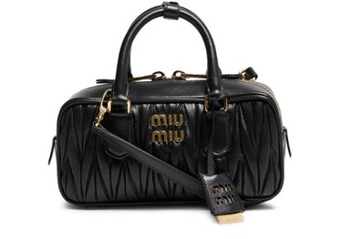 Introducing the Miu Miu Arcadie quilted nappa leather bag, crafted for the modern connoisseur. Its metallic "Miu Miu" lettering and signature quilted herringbone detail embody sophistication. Enjoy versatility with double handles and a detachable strap, all secured by a zipper closure and finished in luxurious gold.