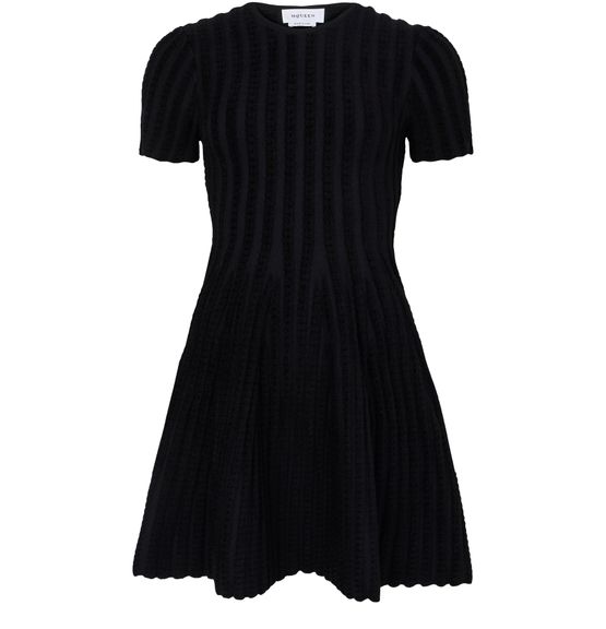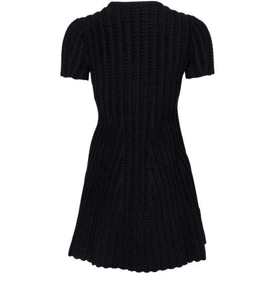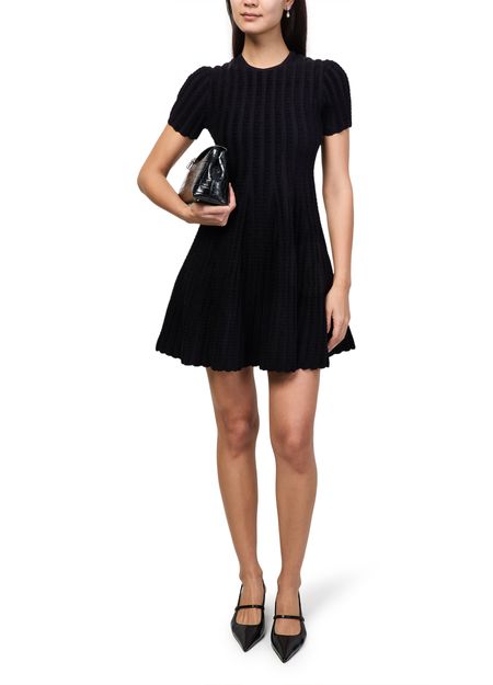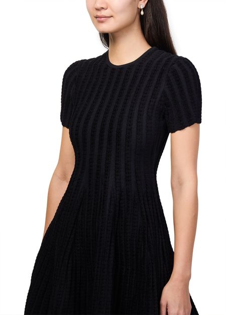 Reveal Alexander McQueen's asymmetric mini dress, crafted from ribbed fabric for a refined texture. The round neck and short sleeves create a balanced silhouette, while scalloped edges and an A-line cut add a modern twist. Perfect for elevating your look at any stylish gathering.