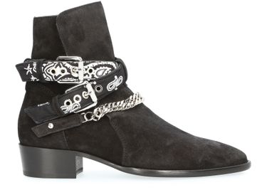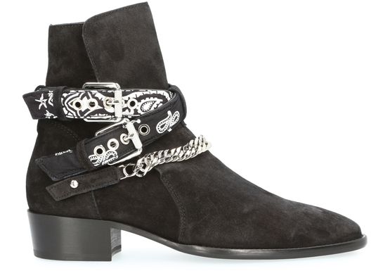 Amiri presents a bold creation with a unique set of textures. These bandana buckled ankle boots have a distinctive elegance, with a metal chain and riveted clasp.