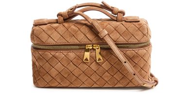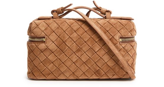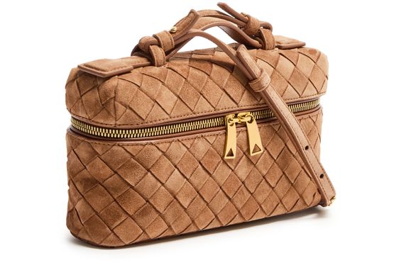Reveal Bottega Veneta's Bang Bang vanity case, crafted in sumptuous suede with the iconic Intrecciato weaving technique. A single handle and thin, adjustable strap offer versatile carrying, while gold-finish hardware and visible stitching add refined detail. The spacious interior compartment ensures effortless organization.