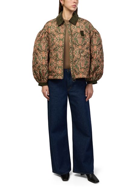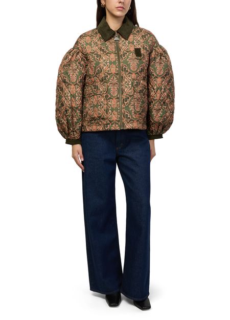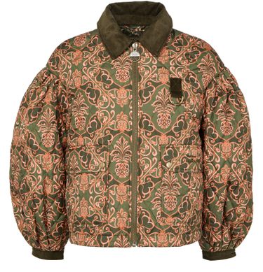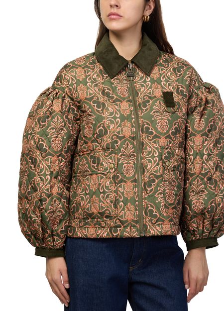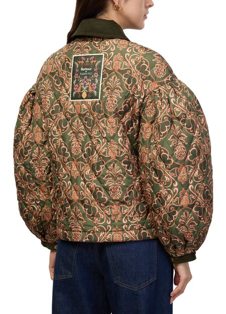 Introducing Barbour's x Farm Rio Luisa quilted jacket, a stylish blend of casual elegance and functionality. This short, long-sleeved piece features a zipper closure and flap pockets, crafted from warm fabric with a padded texture. The Barocco print and topstitched edges add a unique touch, making it perfect for versatile styling.