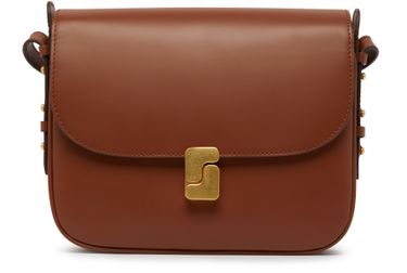 Discover Soeur's Bellissima maxi crossbody bag, a statement piece with sleek gold logo detailing. The design includes a gold finish, worn elegantly on the shoulder with a thin strap. Featuring a single handle, flap closure, and magnetic clasp, it combines style with practicality.