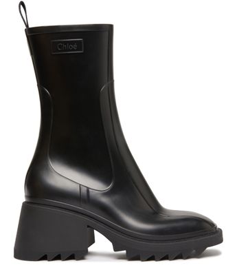 Chloé's Betty boots feature a rounded square toe and a high-top upper with a side zipper for easy wear. The boots also have a back loop for slipping on and off, as well as Chloé's logo and lettering. They are finished with a thick, notched sole and a block heel for added style and comfort.