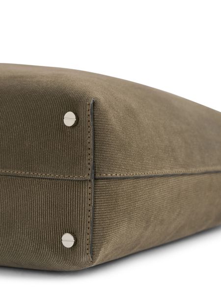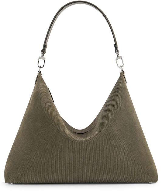 Reveal Toteme's Bevel medium bag, a refined shoulder bag crafted from supple corduroy-effect suede with a single handle. Visible stitching and a streamlined silhouette highlight its modern design, while a secure zipper closure and interior patch pockets offer both style and practicality.