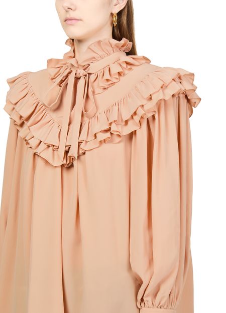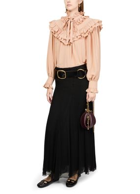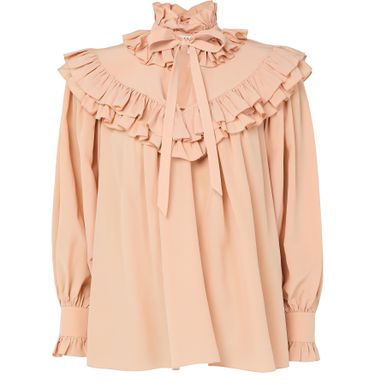 Introducing Chloe's blouse with ruffles, a masterpiece of elegance and style. This loose fit top features a high-neck and long ruffled sleeves, offering a sophisticated silhouette. The bow fastening adds a charming touch, making it perfect for both casual and formal occasions.