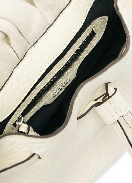 Reveal Isabel Marant's grained leather shoulder bag, a statement piece defined by its decorative chain strap and gold finish. The visible stitching and bead details showcase refined craftsmanship, while the drawstring closure and single handle offer both style and practicality for modern versatility.