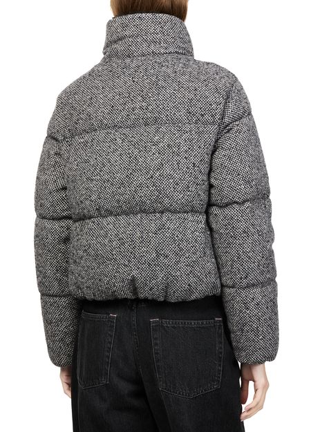 • Description : Checked pattern, marled material, warm fabric, crop, high neck, long-sleeved, lined, zipper closure, padded texture.
