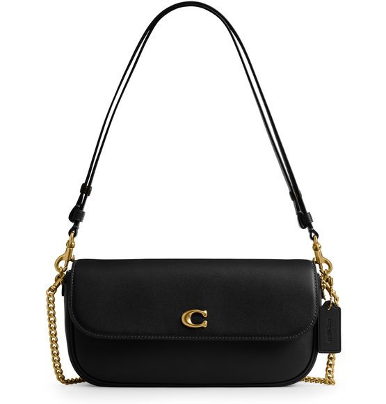 Reveal Coach's shoulder bag, crafted from smooth leather and adorned with a magnetic "C" buckle. The gold finish and front logo add a refined touch, while the single handle and detachable chain strap offer versatile styling. Visible topstitching highlights Coach's attention to detail.