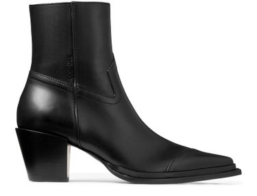 Reveal Jimmy Choo's Cece 60 ankle boots, crafted from smooth leather with a sleek pointed toe and closed design. These Chelsea boots feature a medium block heel and visible stitching, complemented by an engraved logo on the side. The leather outer sole ensures durability and style.