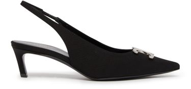 Celine's Alma Triomphe slingback in gros-grain is a stylish blend of elegance and comfort. With a low heel and pointed toe, it offers a refined silhouette. The closed design features a metallic logo on the front and a logo-printed insole, making it a perfect choice for chic, everyday sophistication.
