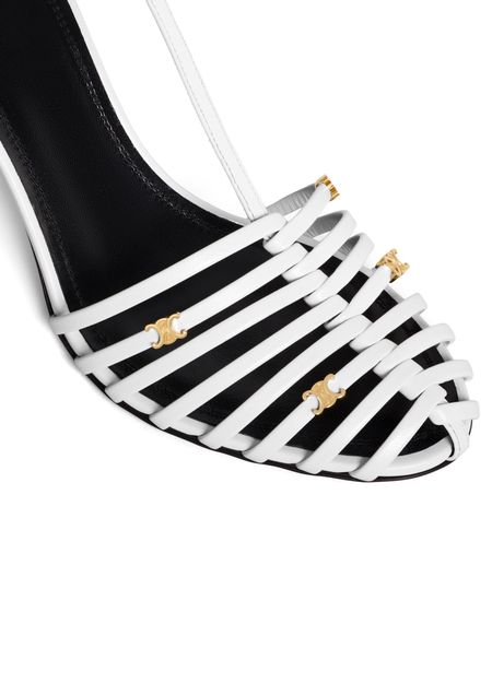 • Description : Conic leather-covered heel, almond toe shape with cage effect, 4 gold metallic triomphes on the straps, triomphe engraved adjustable buckle, leather insole, leather outsole, reference : 366575340c.ooia.