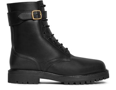 Celine's Kurt lace-up mid boots embody refined elegance with their exquisite 100% calfskin craftsmanship. Featuring a round toe shape and an adjustable leather strap that elegantly conceals a metal zip, these boots showcase Celine's signature on the buckle and the Triomphe debossed detail. A perfect blend of style and comfort, made in Italy.