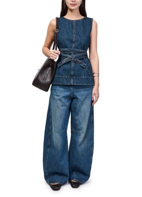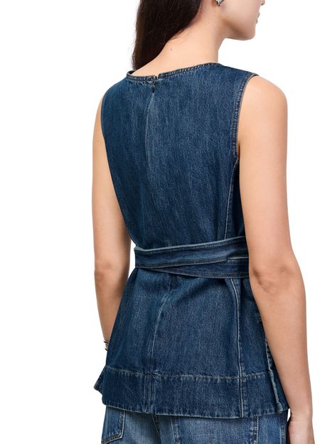 Reveal Soeur's Chance denim top, featuring a round neck and a belted waist for a flattering silhouette. The faded effect and visible stitching add a modern twist, making this top a versatile choice for both casual and elevated looks.