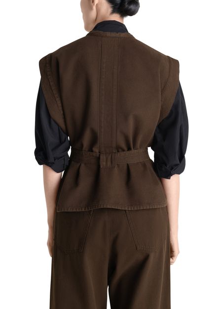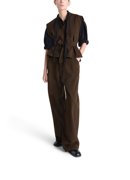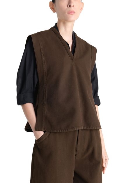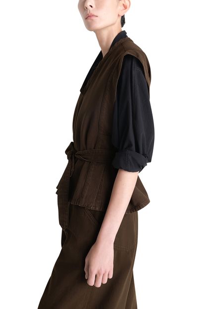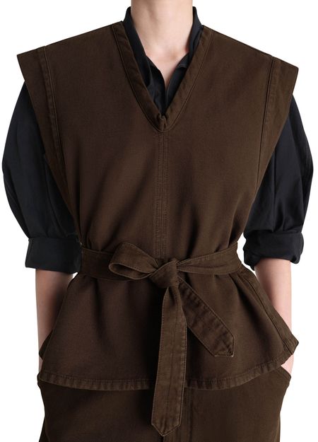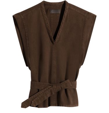 Reveal Lemaire's v-neck belted top, where a refined V-neckline meets a cinched waist for a flattering silhouette. The soft drape and tailored fit make this piece effortlessly versatile, perfect for pairing with tailored trousers or relaxed denim for a polished, modern look.