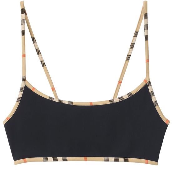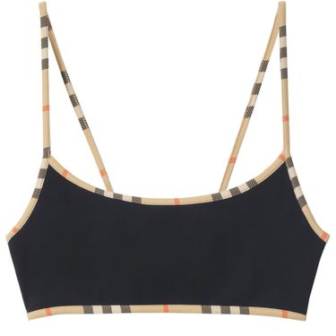 Reveal Burberry's check bikini top, defined by its rectangular neckline and delicate bow fastening. The refined silhouette and thin shoulder straps offer a modern edge, making it perfect for sun-soaked escapes or poolside relaxation. Experience effortless style with this standout piece from Burberry.