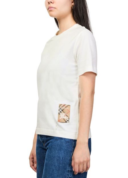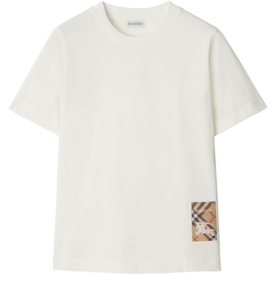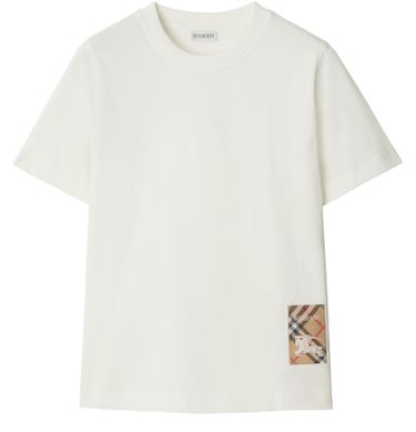 Reveal Burberry's check label cotton t-shirt, featuring a classic crew neck and the iconic embroidered logo. The signature Burberry Check pattern and Equestrian Knight Emblem add a refined touch, making this top a versatile choice for elevating both casual and sophisticated ensembles.