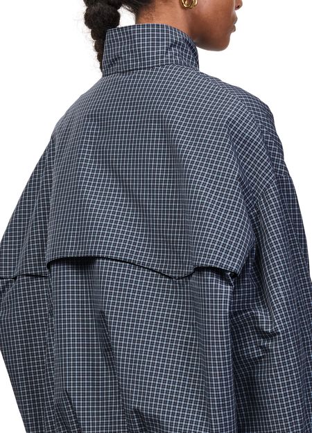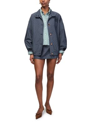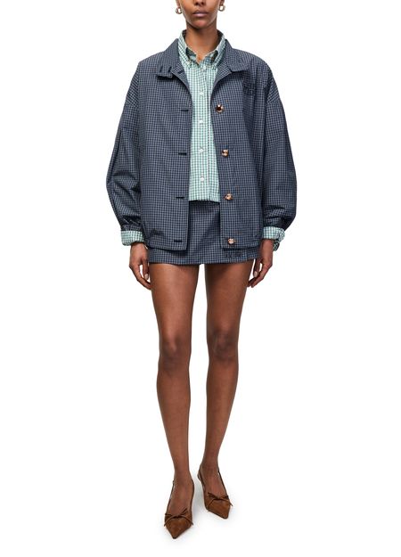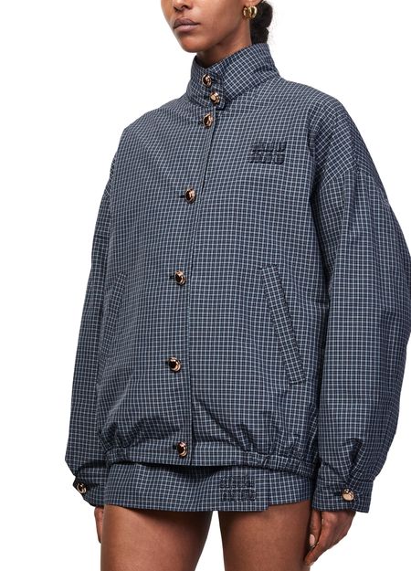 Reveal Miu Miu's checkered jacket, a short, long-sleeved piece with a high neck and button fastening. The embroidered chest logo and gold finish add refined detail, while side pockets offer practicality. Its checked pattern and versatile silhouette make it perfect for elevating everyday or evening looks.