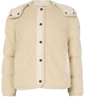 Reveal Moncler's Ciboulette short parka, crafted from warm fabric with a bi-material design for a modern silhouette. The collarless, long-sleeved cut features button fastening, side pockets, and topstitched edges. Its padded texture and versatile style make it a standout for both casual and elevated looks.