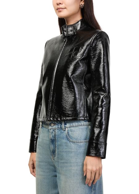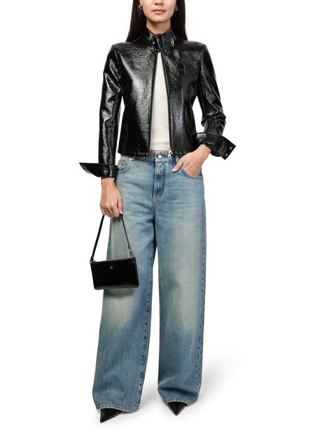 Reveal Courreges's city zipped vinyl jacket, a short, long-sleeved piece crafted from patent leather with a padded texture. The high neck and zipper closure add a modern edge, while its versatile silhouette transitions effortlessly from day to night, making it a standout in any wardrobe.