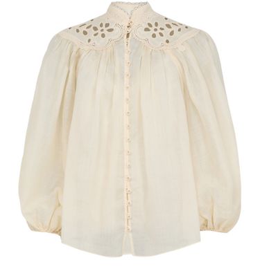 Embrace Zimmermann's Coco embroidered blouse, a fusion of elegance and style. Featuring a high-neck and puff long sleeves, this loose fit top is adorned with intricate floral embroidery. The button fastening adds a touch of sophistication. Perfect for pairing with tailored trousers or a flowing skirt.