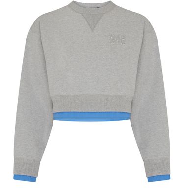 Miu Miu's Cotton fleece sweatshirt showcases a stylish cropped silhouette with a classic crew neck. Its long-sleeved design is adorned with an eye-catching appliquéd logo across the chest, adding a touch of playful elegance. Perfect for layering or wearing solo, this piece effortlessly blends comfort with high-fashion flair.