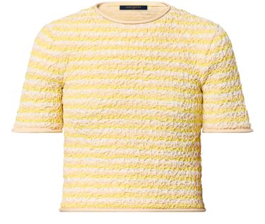 This short-sleeved top is chic and contemporary thanks to an upbeat pastel palette and a sophisticated knit technique. The flexible form-fitting crinkled finish recalls the rich texture of the runway’s smocked pieces, while classic horizontal stripes complete the look with a playful graphic touch.