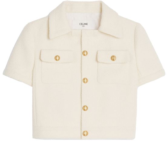 • Description : classic fit, cropped length, shirt collar, 2 patch pockets with flaps on the chest, 4 Celine blason press studs, 1 Celine blason press stud on the chest pockets, made in France, reference : 2V97O371R.01RD.