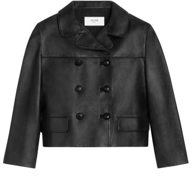 Unveil Celine's cropped jacket in soft lambskin, a classic fit masterpiece featuring a notch collar. This stylish piece boasts a cropped length with 2 flap pockets and 6 covered buttons, perfect for a modern wardrobe.