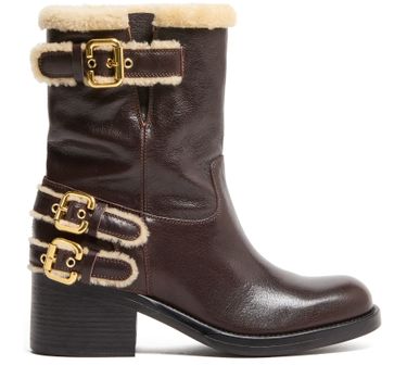 • Description : Boots & ankle boots, smooth leather, block heel, medium heel, closed, round toe, buckled strap, wool lining, gold finish, contrast details.