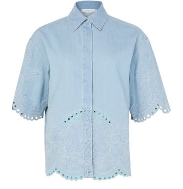 • Description : Floral embroidery, denim, buttoned-down collar, short-sleeved, concealed closure, embroidered details, scalloped edges.