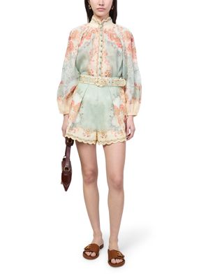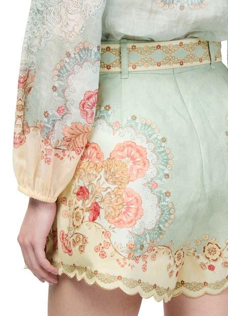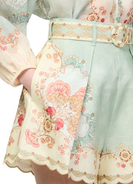 Reveal Zimmermann's Daylight shorts with darts, featuring a vibrant floral print and delicate scalloped edges. The button fastening and detachable belt offer both style and versatility, while embroidered details add a refined touch—perfect for elevating your warm-weather wardrobe with effortless sophistication.