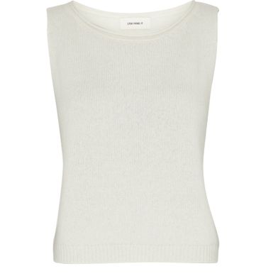 Introducing Lisa Yang's Devine knitted vest. This sleeveless piece features a round neck and regular length, adorned with an appliquéd logo and visible stitching. Perfect for layering over tanks & camisoles, it combines stylish flair with casual sophistication.