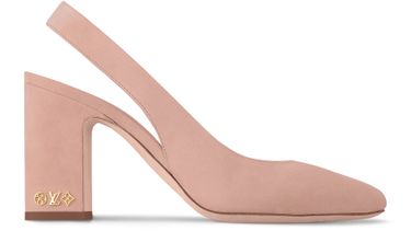 The Donna slingback pump is crafted from suede baby goat leather with a smooth, velvety texture. This sophisticated style combines a sleek, rounded upper with a steady block heel, which is embellished with tiny, gold-tone Monogram studs. The back strap has a discreet elastic insert for easy fitting.