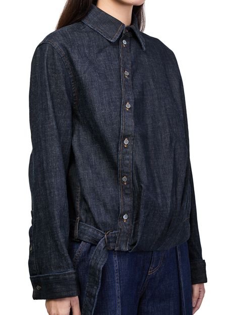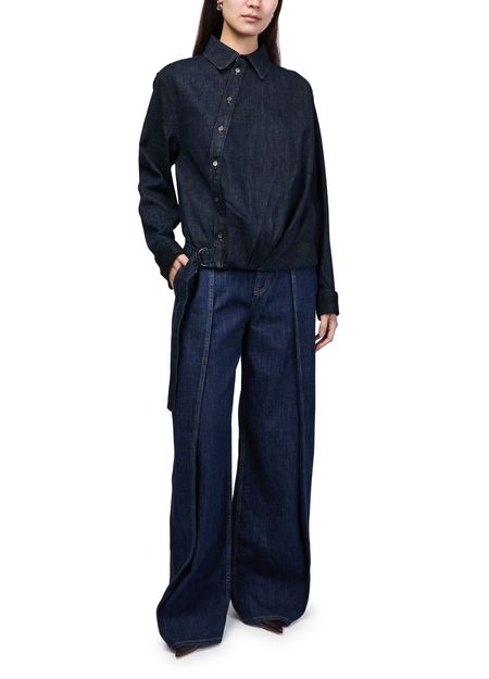 Reveal Loewe's draped denim shirt, a modern top featuring long, cuffed sleeves and a fitted waist for a refined silhouette. The front buttoned closure and contrast stitching add a distinctive touch, making this piece a versatile choice for elevating both casual and sophisticated looks.