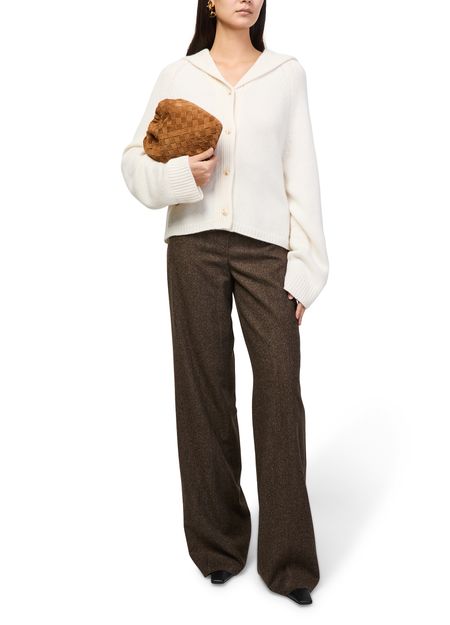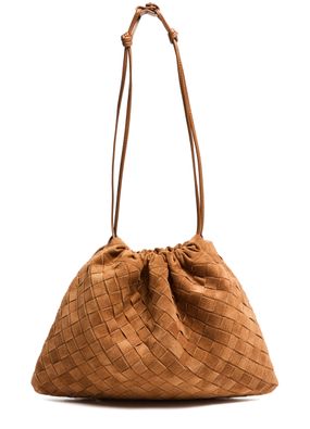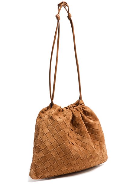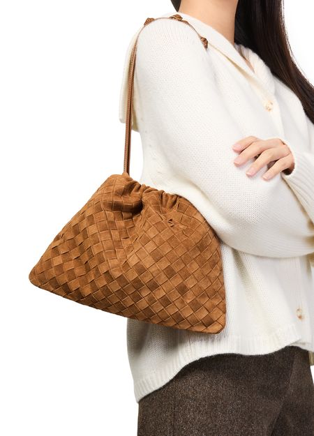 Reveal Bottega Veneta's Dubstag shoulder bag, showcasing the iconic Intrecciato weaving technique. The padded texture and visible topstitching add a refined touch, while the thin strap and drawstring closure offer both style and practicality. A statement piece for those who appreciate modern craftsmanship.