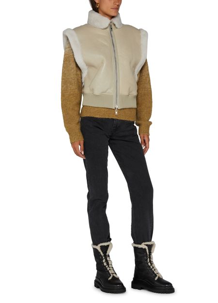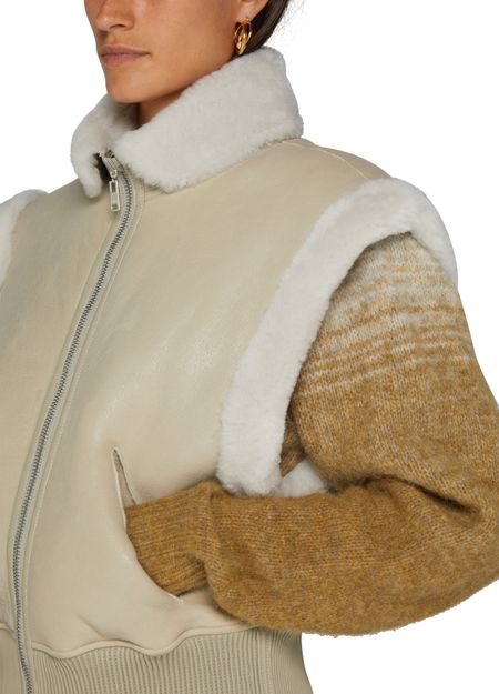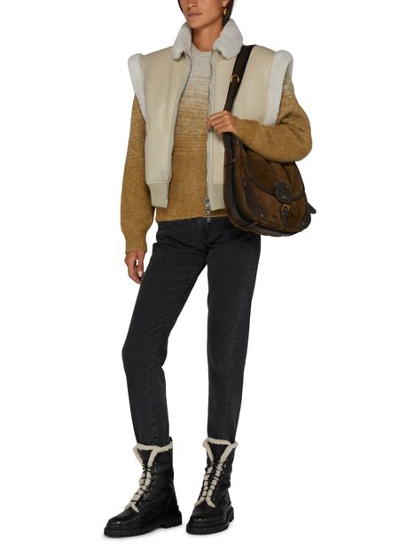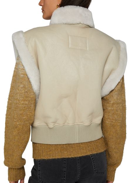 Isabel Marant's Edwina jacket showcases a sleeveless, short design with a sleek zipper closure. Its luxurious leather and fur blend adds sophistication, while the silver finish elevates its style. Practical side pockets offer functionality, and the logo at the back label subtly signifies its high-fashion heritage, making it a must-have piece.