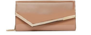 Jimmy Choo's Emmie clutch bag is a stylish minaudière clutch featuring a chain strap for versatile wear. It is designed with a single handle, zippered interior pocket, and gold finish details. The snap-button fastening and flap closure make it easy to access. It can be worn on the shoulder and has interior slots for cards. The metallic logo on the front adds a touch of...