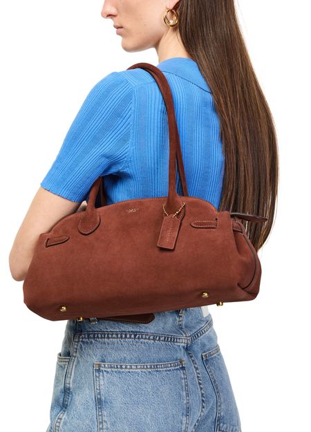 Reveal Coach's Empire Carryall 34 shoulder bag, crafted from sumptuous suede with double handles and a thin strap for versatile wear. The gold-lettered front logo, detachable keyring, and zippered interior pocket combine style and function, while visible topstitching and accents add a refined touch.