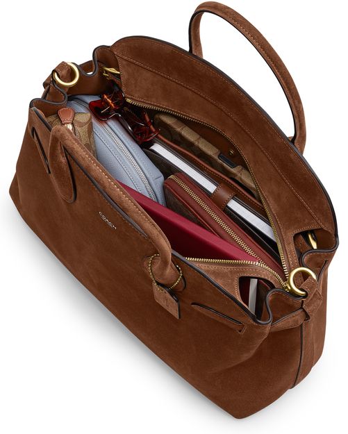 Reveal Coach's shoulder bag, a modern statement with a decorative label featuring the embossed Coach logo. The thin, detachable strap and visible topstitching add refined detail, while the gold finish and front logo in gold letters ensure a polished, standout look for any occasion.